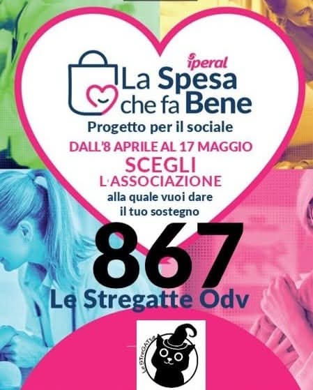 SEI UN CLIENTE IPERAL? DALL’8 APRILE AL 10 MAGGIO Guadagna cuori facendo la spesa per sostenerci! Ogni 10€ di spesa guadagnerai un cuore che verrà automaticamente caricato sulla tua CartAmica Iperal. Con la CartAmica Oro i cuori raddoppiano! Scegli la nostra associazione per sostenerci e donaci i tuoi cuori comunicando il codice 867 alla cassa, oppure utilizza comodamente l’apposita sezione su APP IPERAL!AAA CERCASI VOLONTARI PER RACCOLTE PAPPA Oltre cento gatti da sfamare sono una bella impresa, e per garantire loro succulente pappe per riempire quei pancini esigenti è necessario essere costanti con le raccolte pappa nei pet store che ci ospitano. Vuoi essere dei nostri? Basterà che ci dedichi una o due mezze giornate al mese! Contattaci per diventare parte attiva del gruppo, e condividi per aiutarci a trovare più aiutanti possibili!PUNTI FIDATY ESSELUNGA: PAPPA PER I MICI DI COLONIA Vuoi che anche i nostri micioni abbiano sempre la pancia piena? Per riempirla puoi donare i tuoi punti a Le Stregatte che li trasformeranno in buoni per acquistare tanta pappa. Contattaci in privato per avere il numero di Fidaty a cui donare. Non sei cliente Esselunga? Puoi aiutarci semplicemente condividendo il nostro appello in modo che raggiunga più persone possibili e che le pappe per i nostri micioni si moltiplichino a dismisura! Donare è semplice: Tramite applicazione. Sul sito Esselunga. Recandoti in qualsiasi punto vendita.PUNTO DI RACCOLTA CIBO PER I GATTI DI COLONIA