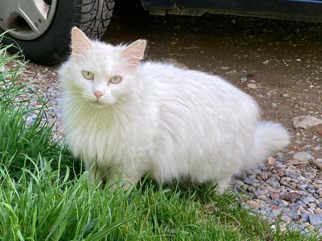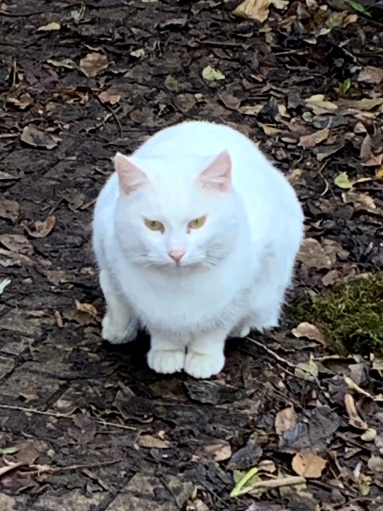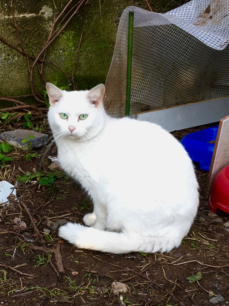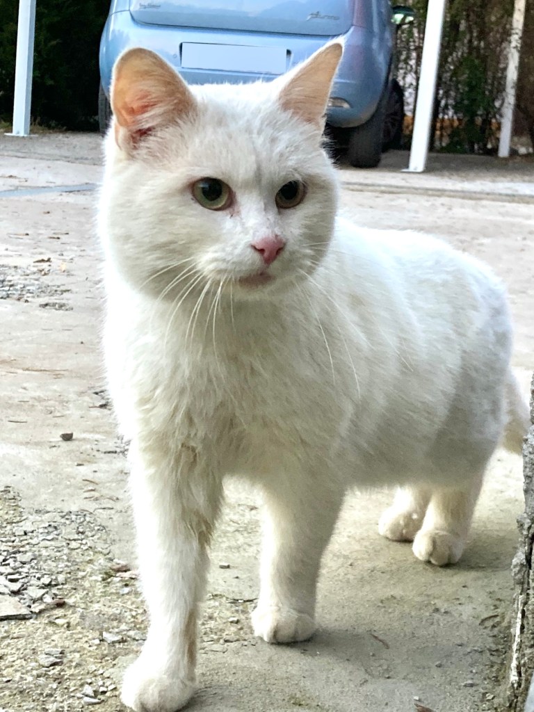 Un batuffolone imponente e schivo, il maggiore di una famiglia di gatti bianchi, tra cui Paolina, minuscola gatta senza orecchie che ricorda la civetta Edvige.