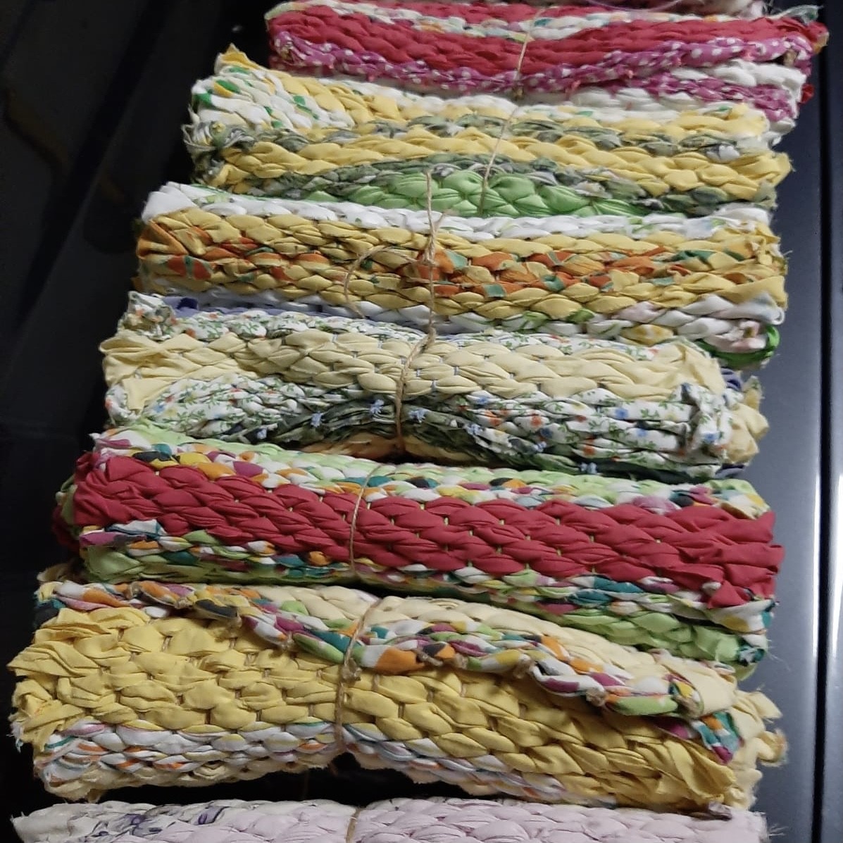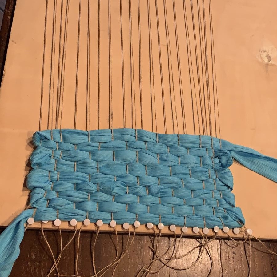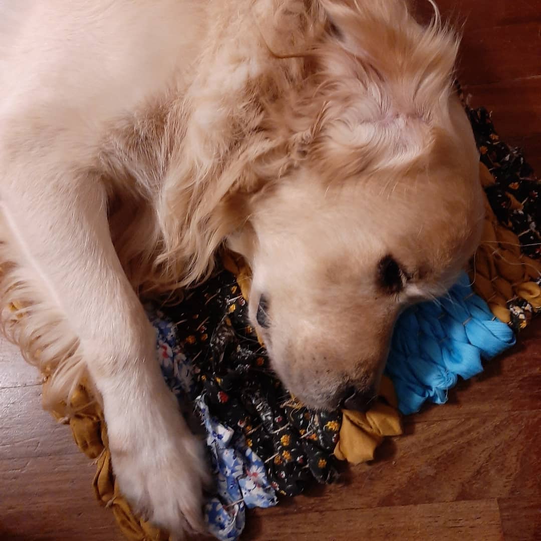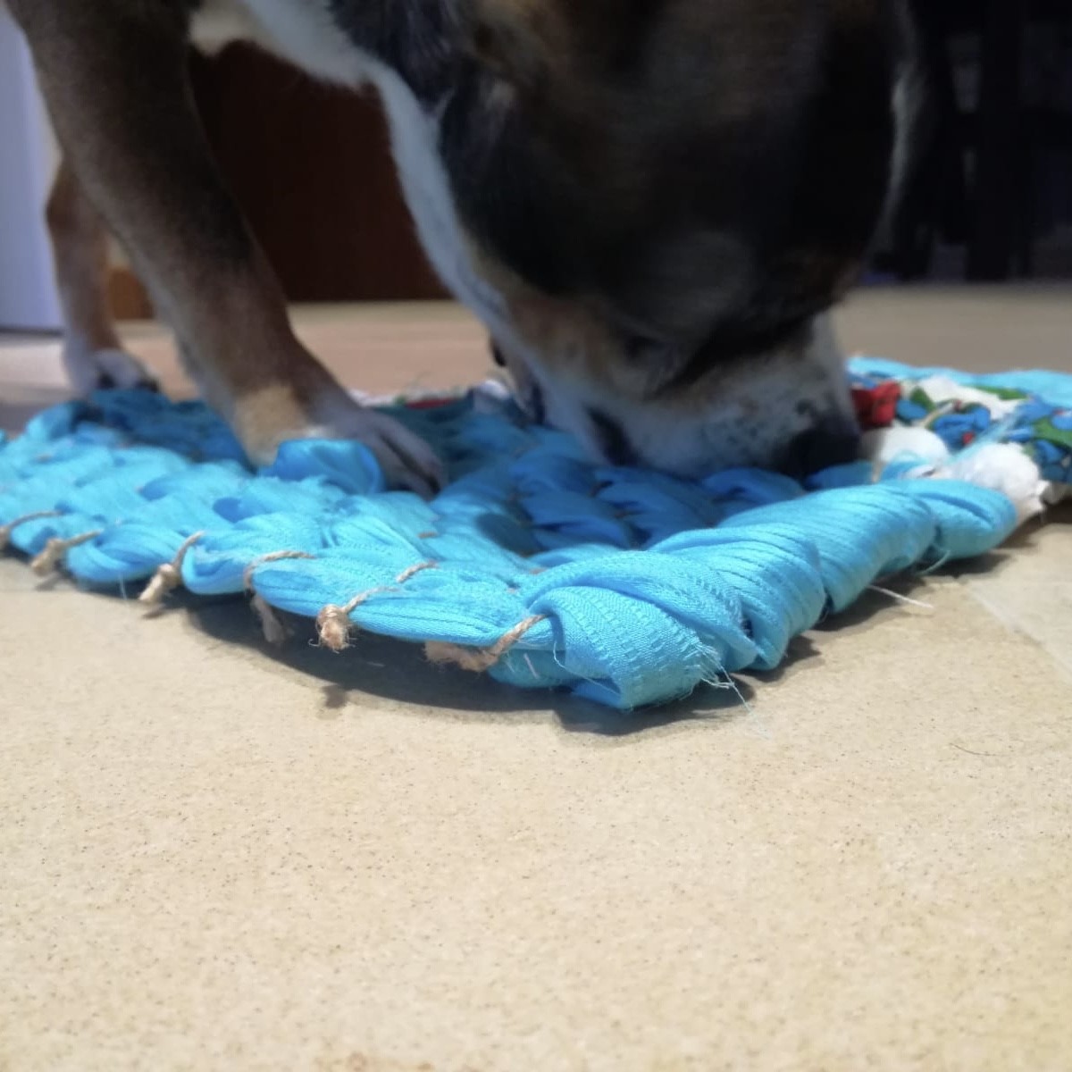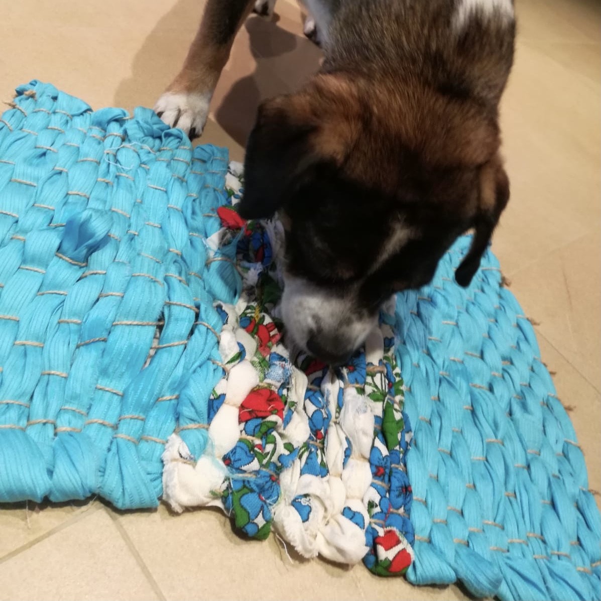 Gioco di attivazione mentale tessuto a mano con materiali di riciclo. Nascondi, tra le trame, dei premietti per il tuo amico e attiva il suo fiuto e la voglia di giocare. Per i più pigri può essere anche un ottimo tappetino relax.