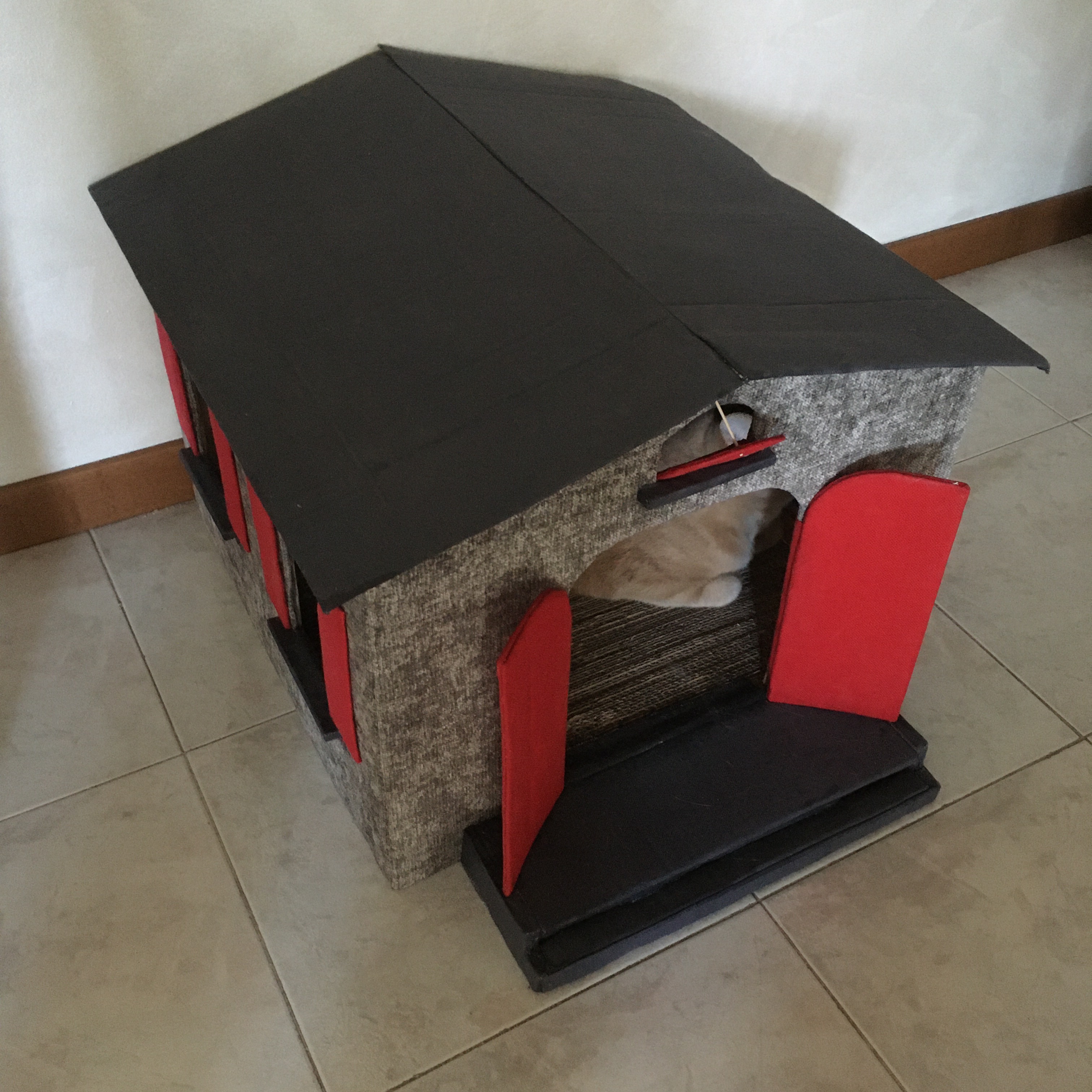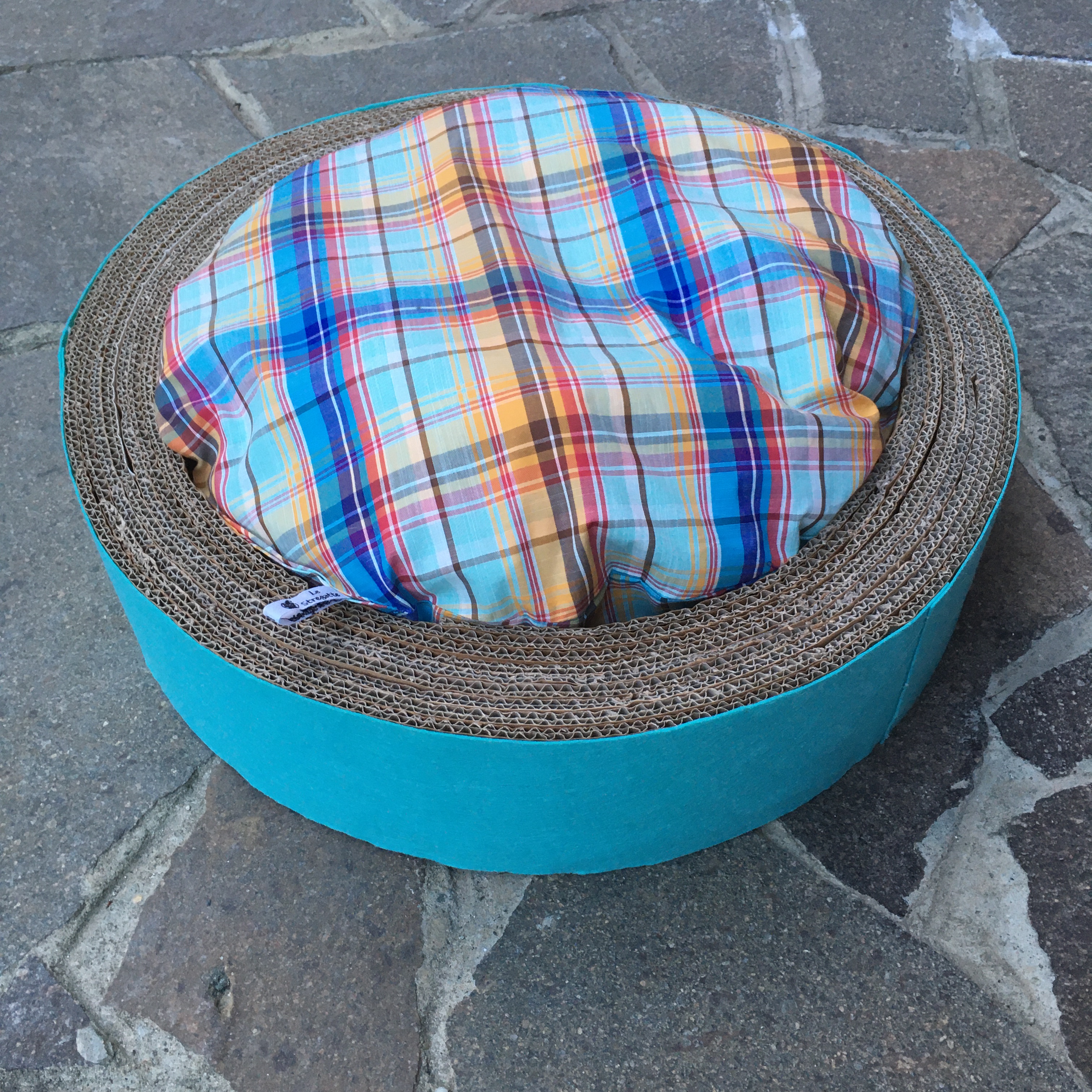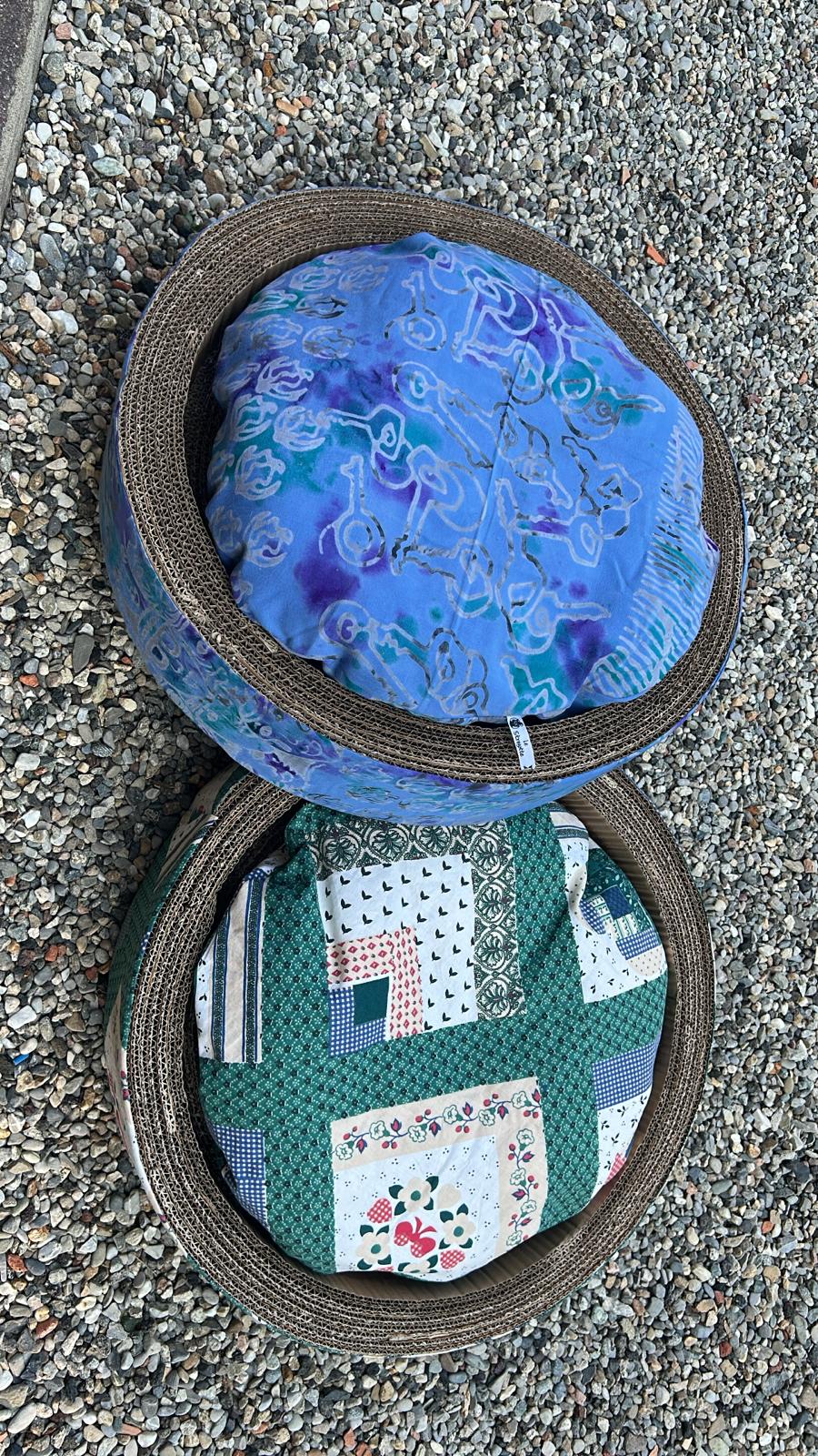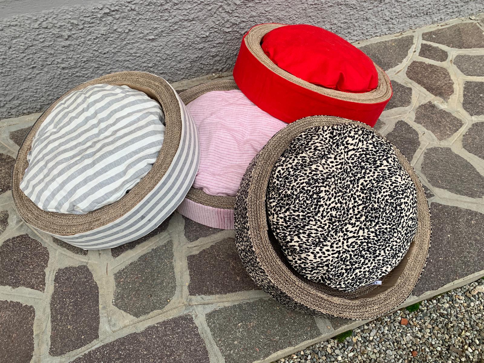 Ottimizza lo spazio con questa cuccia\tiragraffi completa di morbido cuscino. Fatta completamente a mano con cartone riciclato, rivestita di tessuto, è personalizzabile in colori e misure. Un comodo giaciglio e un apprezzatissimo e utilissimo tiragraffi.