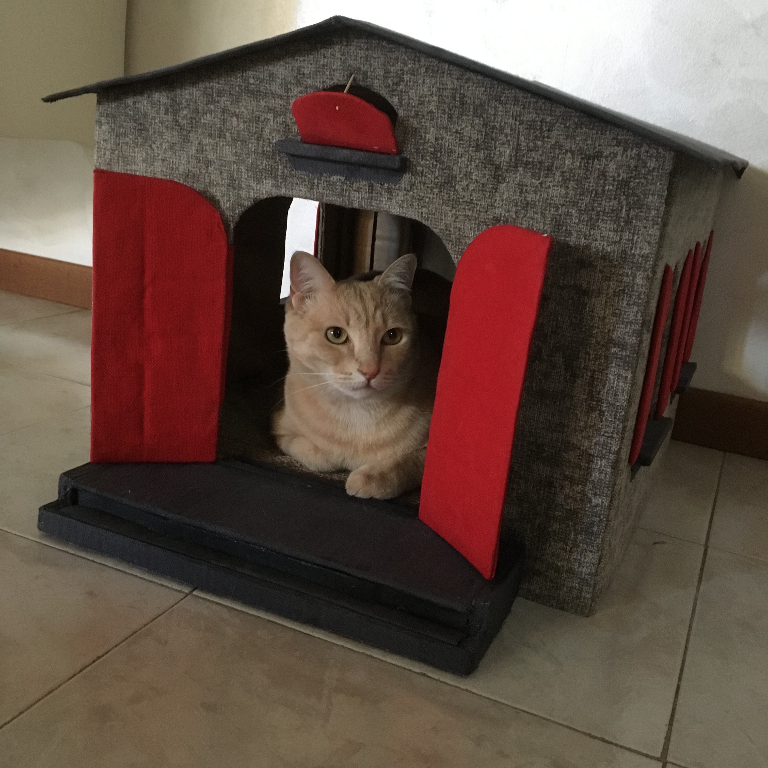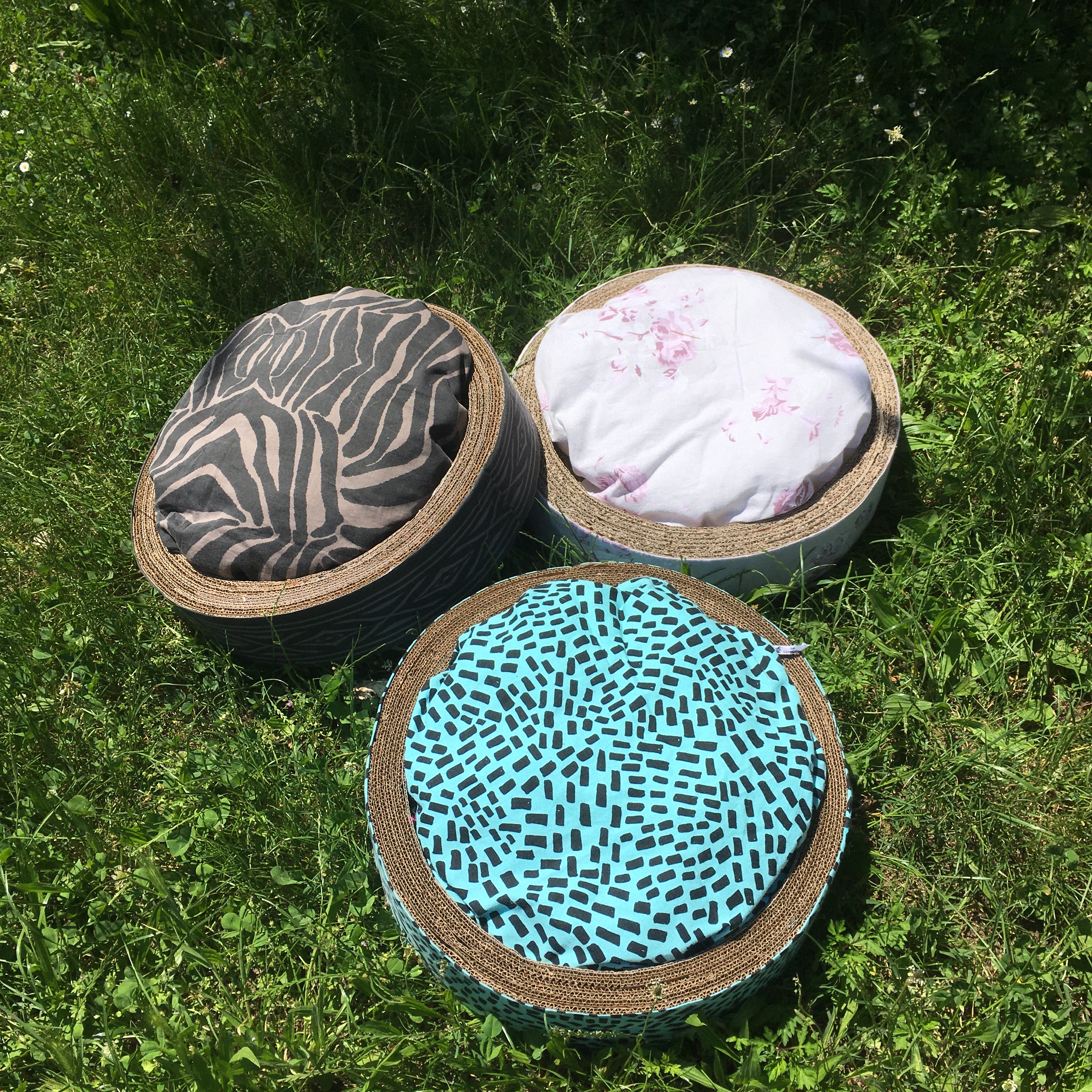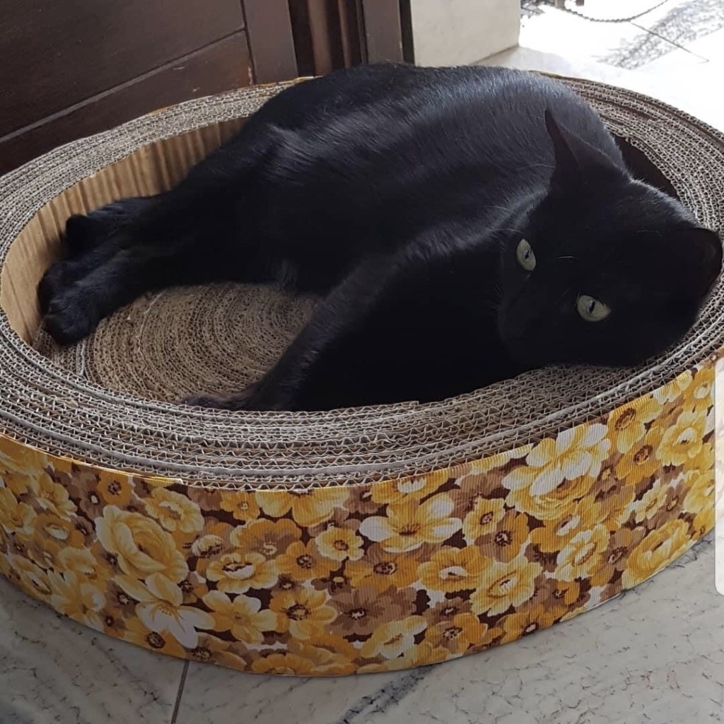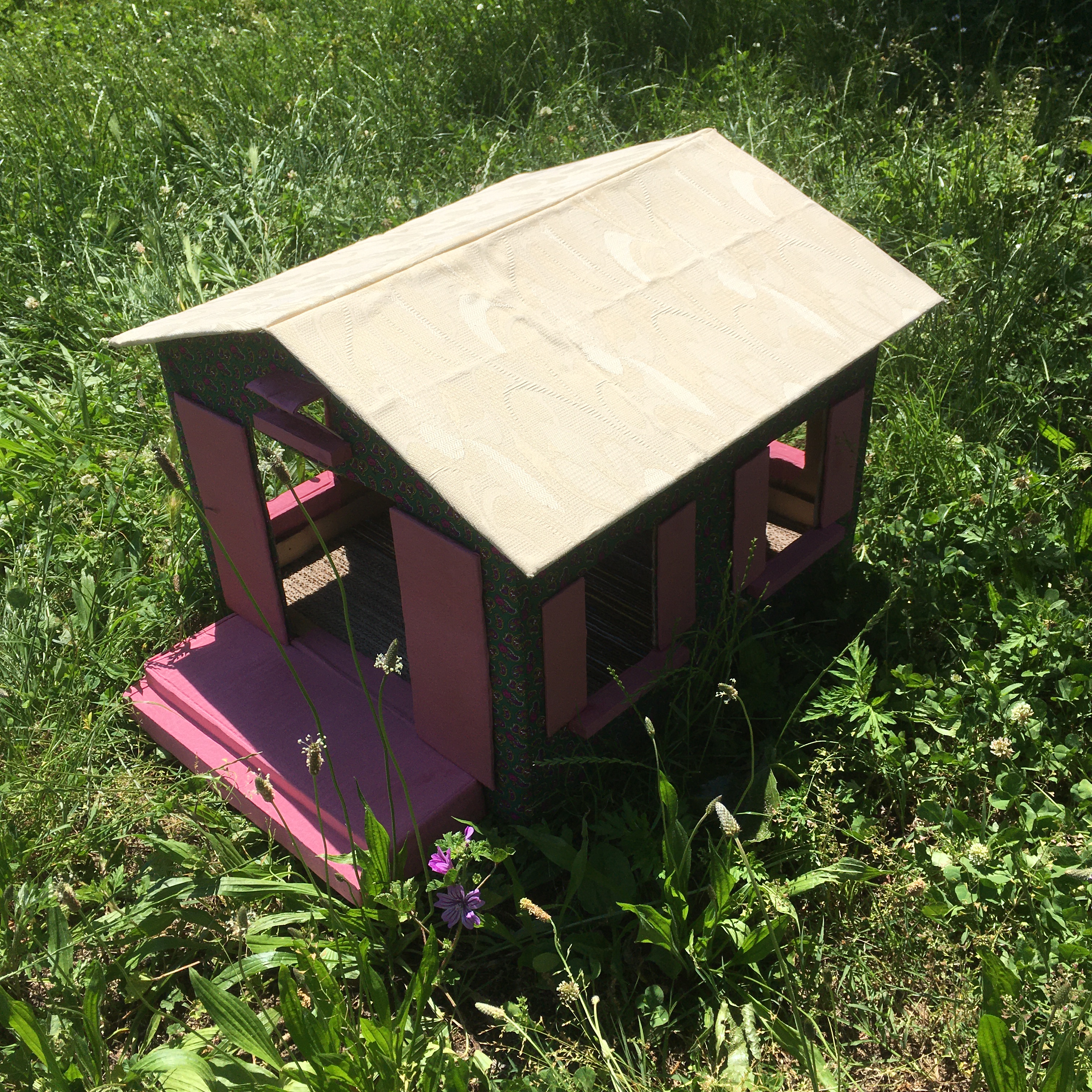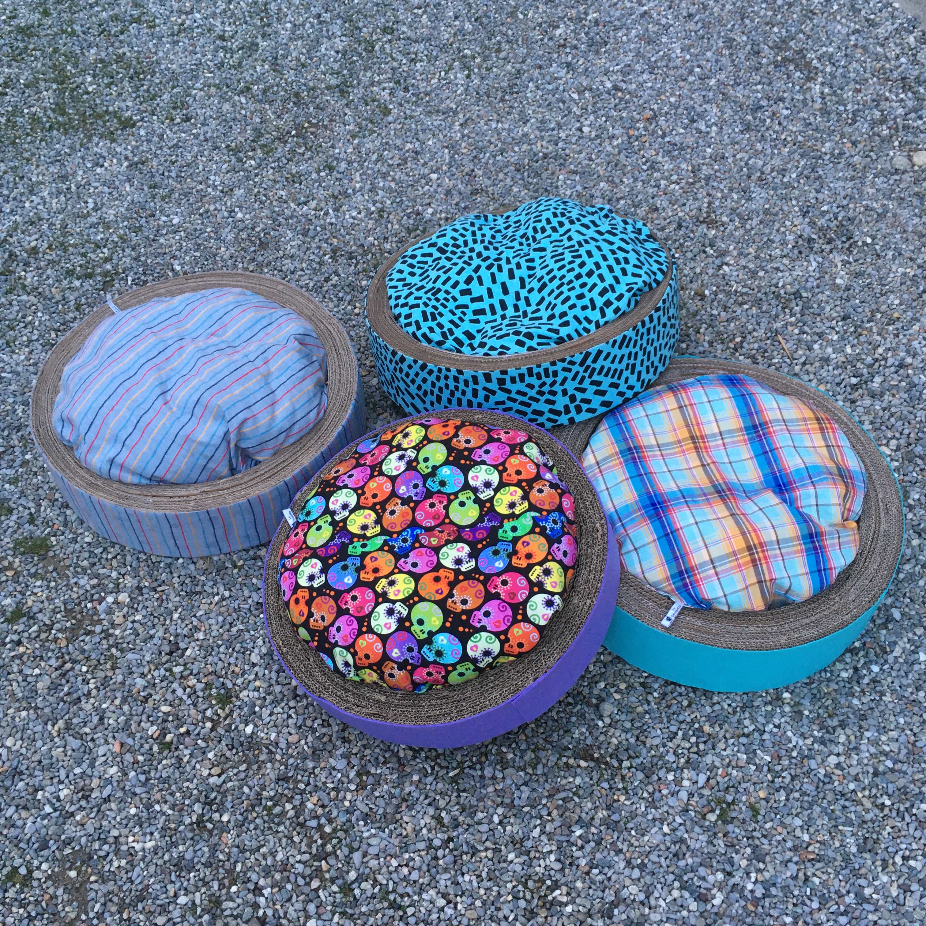 Ottimizza lo spazio con questa cuccia\tiragraffi completa di morbido cuscino. Fatta completamente a mano con cartone riciclato, rivestita di tessuto, è personalizzabile in colori e misure. Un comodo giaciglio e un apprezzatissimo e utilissimo tiragraffi.