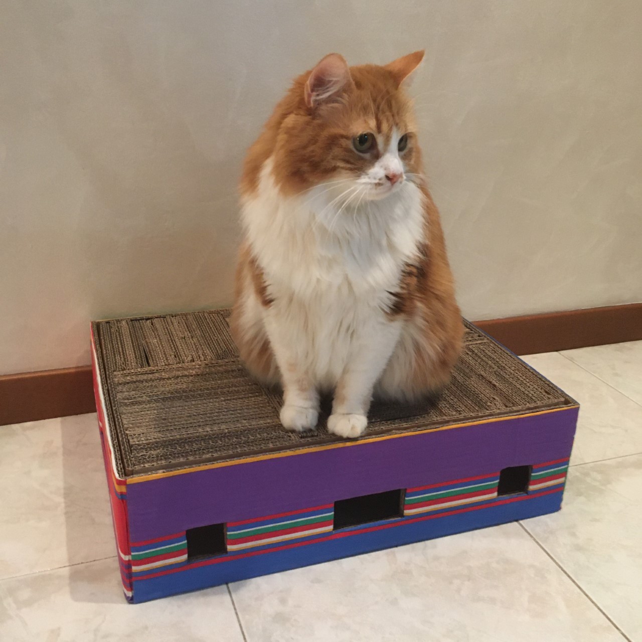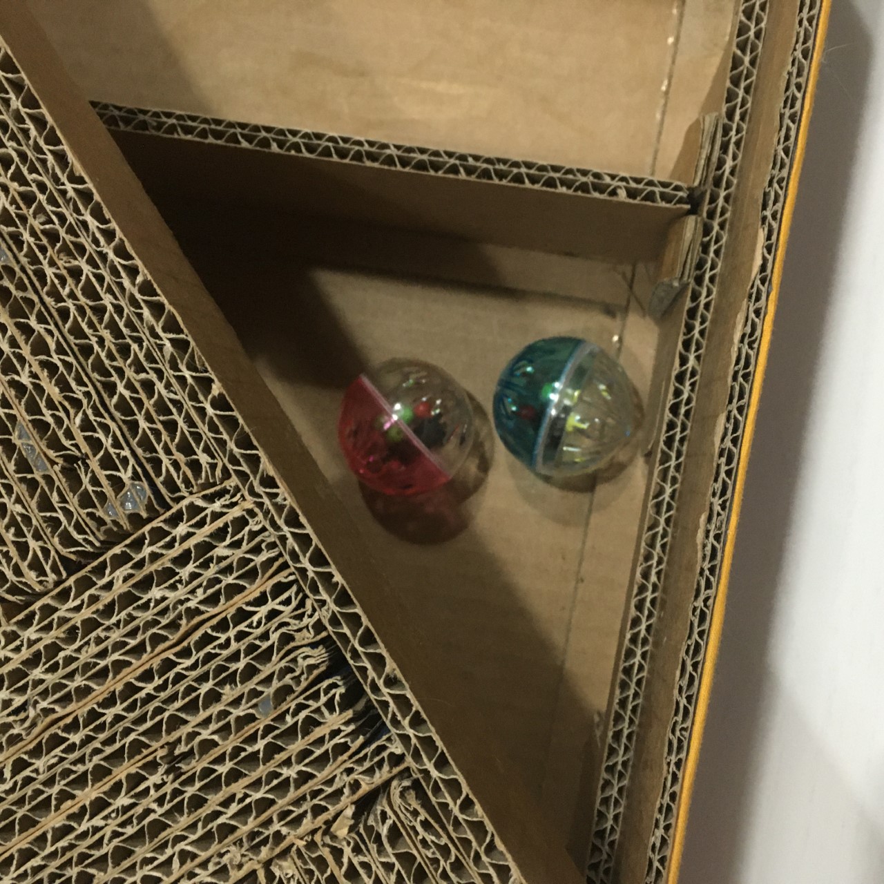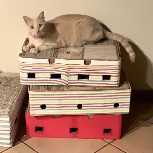 Elemento salvaspazio fatto in cartone di riciclo, che consente di coniugare l’utile al dilettevole. L’utilità della funzione “tiragraffi” consentirà al vostro gatto di prendersi cura delle unghie senza rovinare mobili e divani, la funzione “gioco” lo aiuterà a divertirsi, fare dell’esercizio fisico e scaricare le energie, semplicemente inserendo all’interno del tiragraffi una pallina o degli snack!